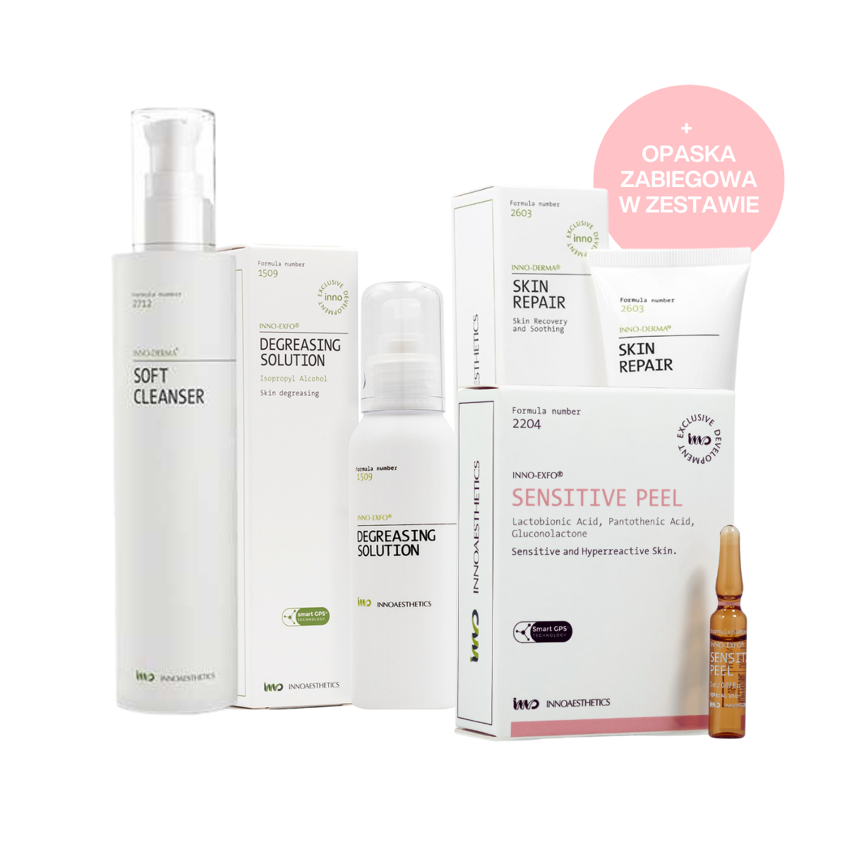 Specjalny pakiet stworzony wyłącznie dla uczestników grupy webinarowej. To kompletny, gabinetowy rytuał pielęgnacyjny dla skóry wrażliwej, nadreaktywnej i skłonnej do zaczerwienień. Zestaw łączy delikatne oczyszczanie, profesjonalne przygotowanie skóry, specjalistyczny peeling dla skór wrażliwych oraz intensywną regenerację kremem, a całość uzupełnia wygodna opaska zabiegowa.